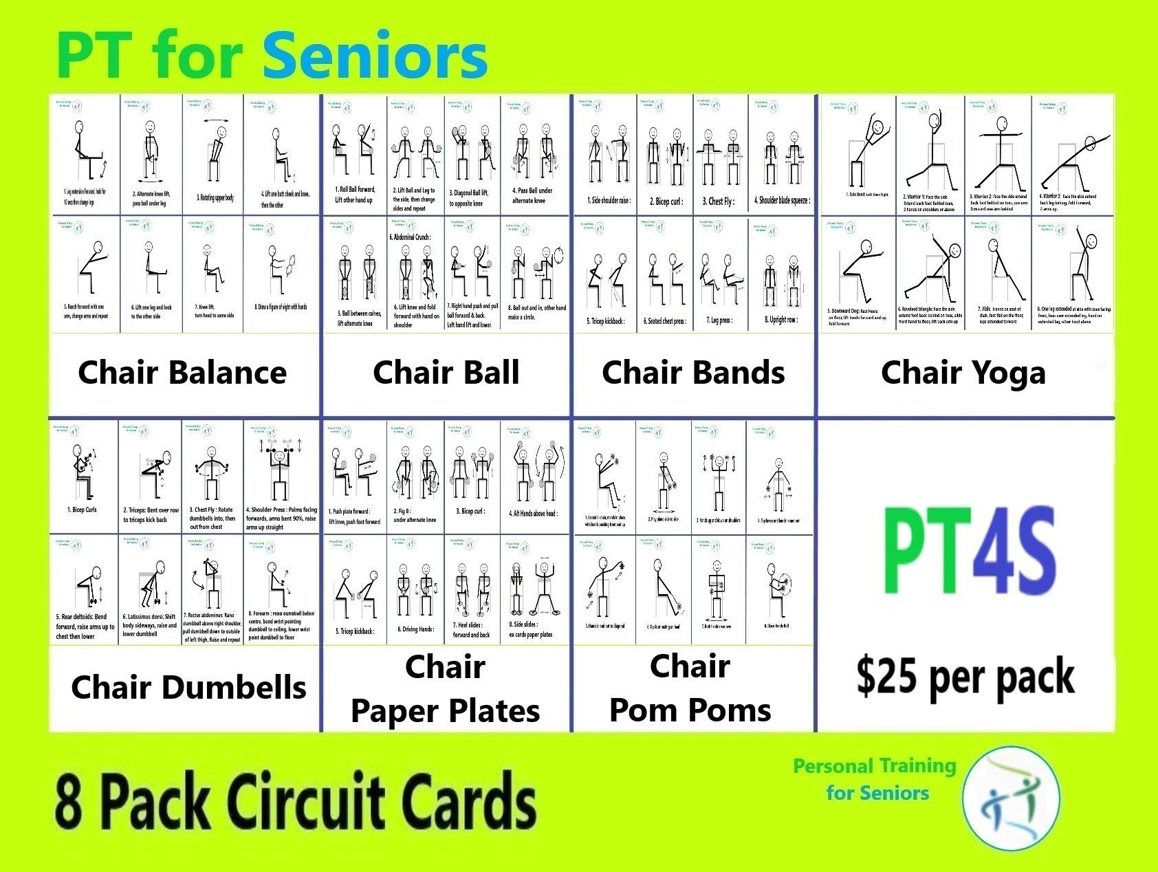 They come in packs of 8 exercises and can be mixed and matched to suit different class needs.